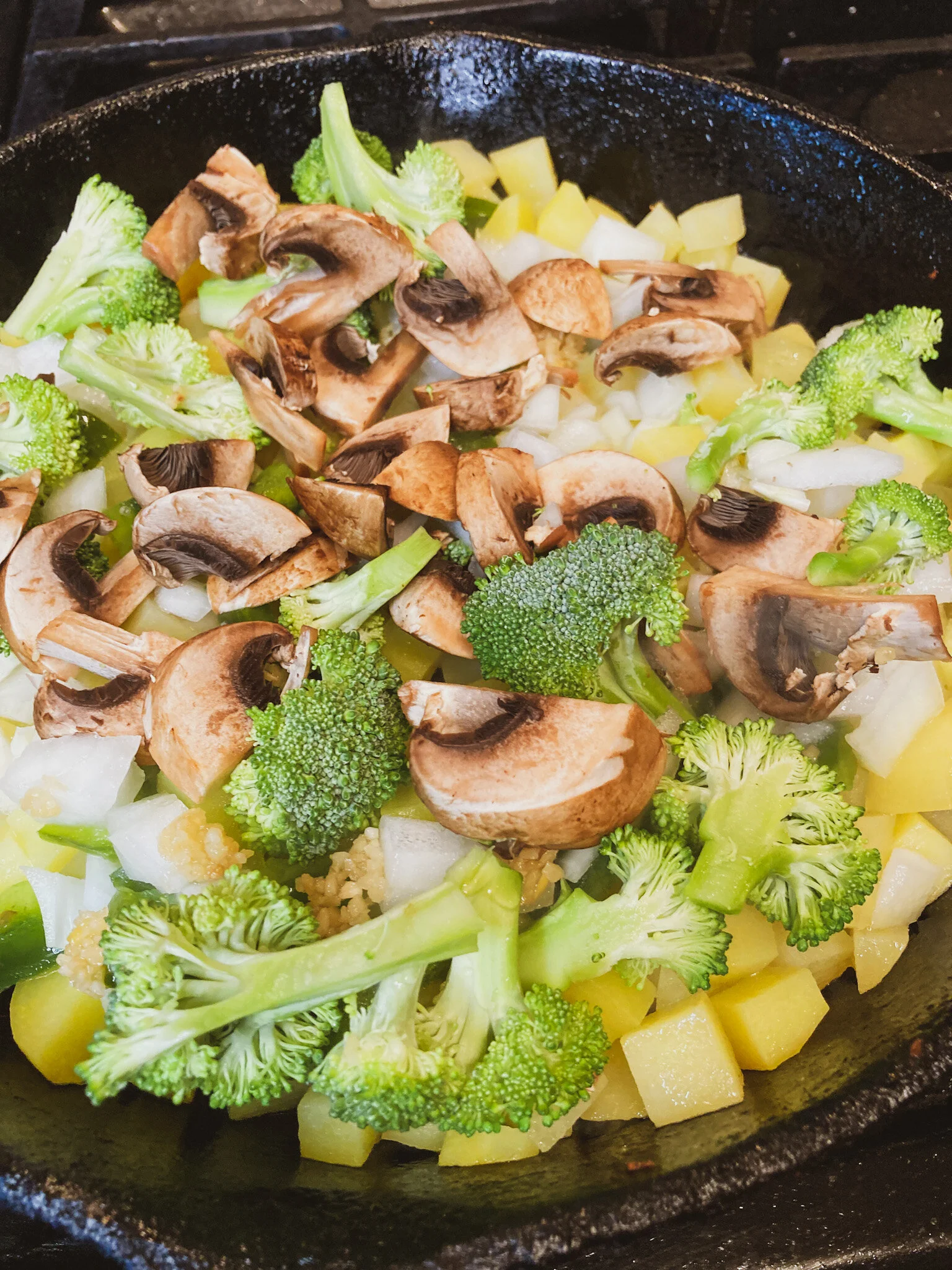 How are these hashbrowns different? What adds the slay factor? The yellow potatoes are accompanied by onion, garlic, green bell pepper, mushrooms and broccoli florets perfectly fried in a cast iron skillet. Only six fresh ingredients, not including the oil, salt and pepper.